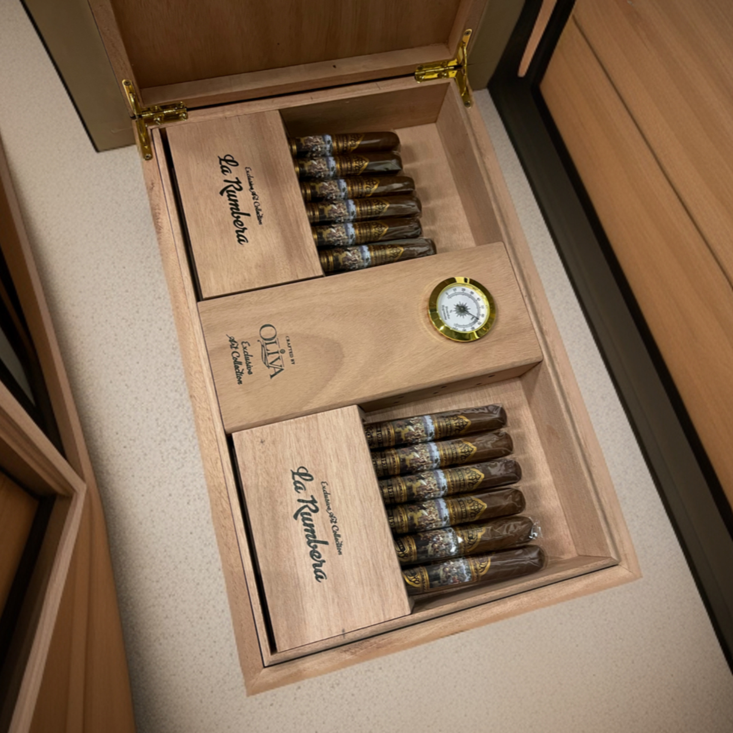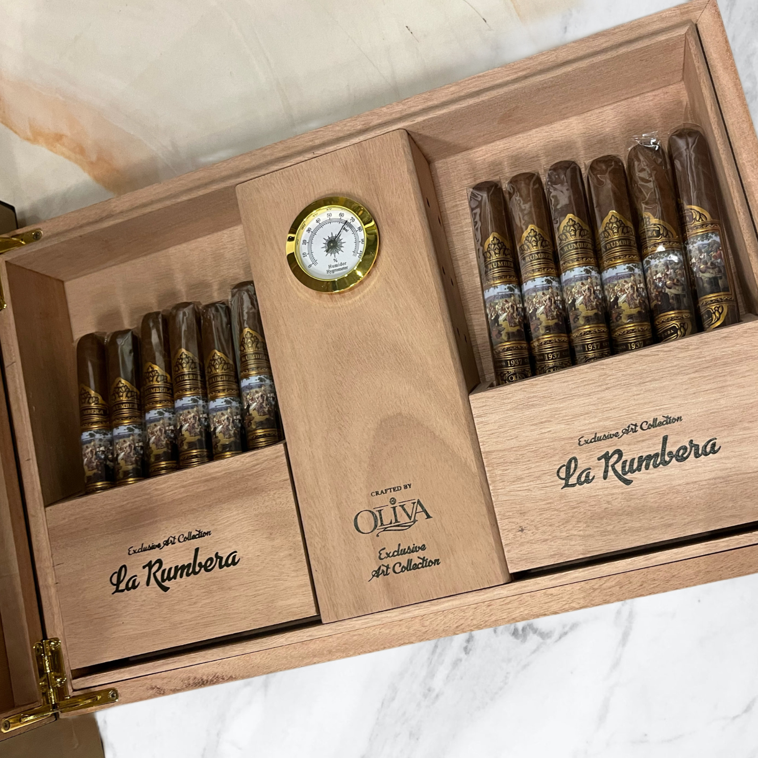 Rooted in the rich tradition of Cuban cigar culture, La Rumbera 1937 pays homage to the centuries-old art of cigar making. Introducing the La Rumbera 1937 Art Humidor: a stunning piece of art crafted to grace the walls of your favorite spaces, whether at home, in the office, on a boat, or in an RV. Each humidor, made from premium African cedar, is a testament to our commitment to excellence and intricate design. Complete with selection of La Rumbera 1937 cigars, blended by Oliva’s Cigar Master Blender, Pablo Rodríguez, our humidors keep your cherished cigars in perfect condition while embodying the timeless elegance and sophistication of the cigar lifestyle.