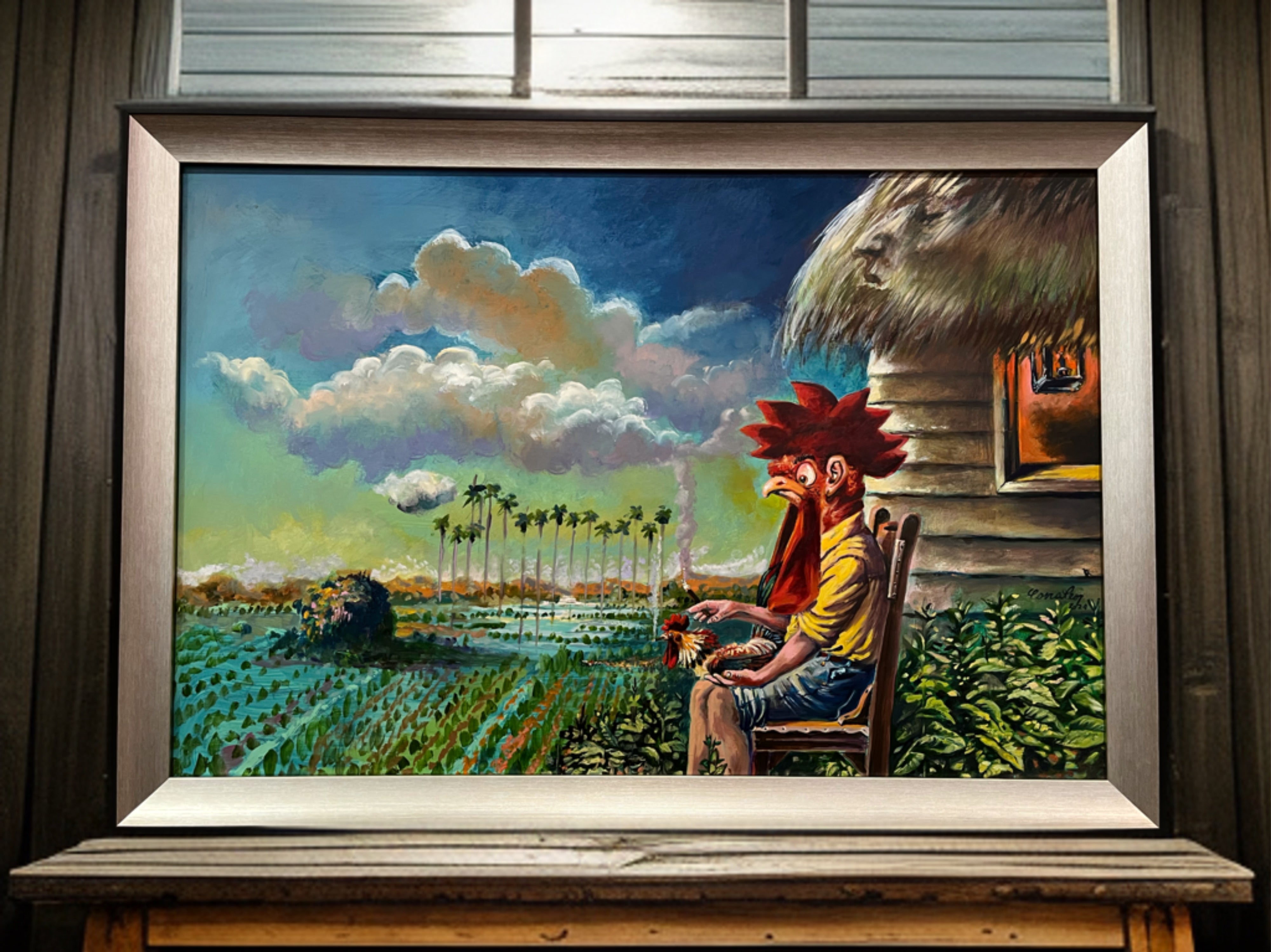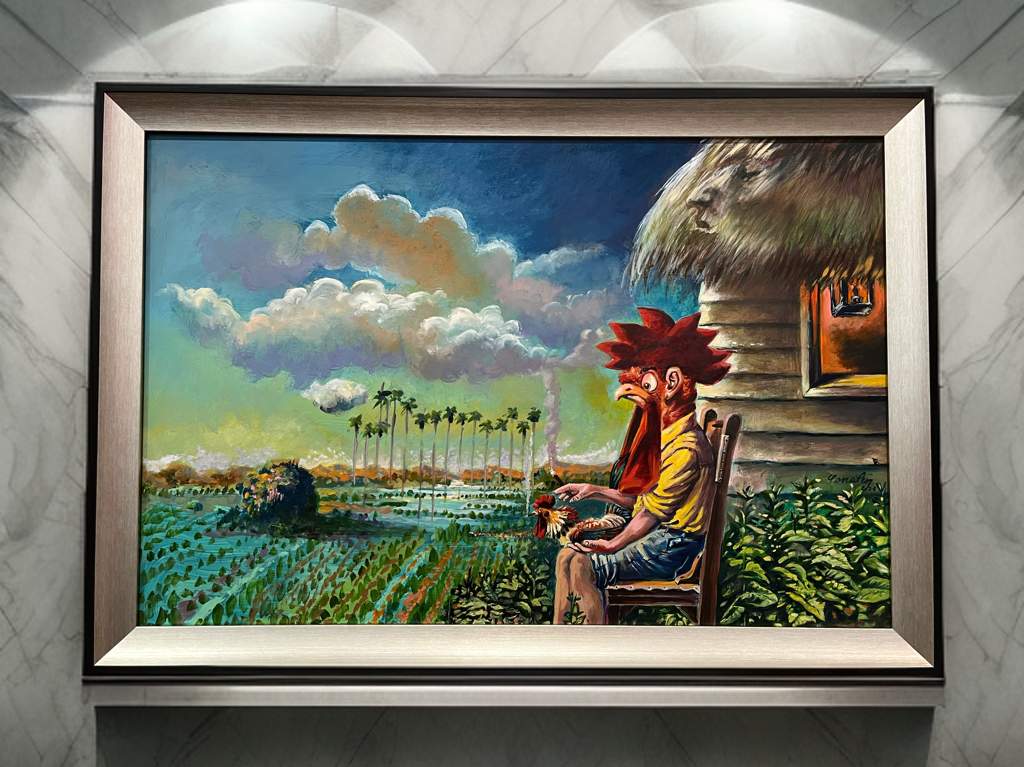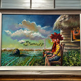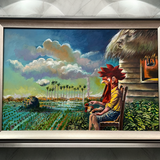 Introducing this Original Art Work by Omar Corrales, crafted in our Humidor La Rumbera 1937. This 96 Cigars Humidor is a masterpiece that combines art and functionality in one stunning piece. Explore "Country Landscape" a captivating painting where a nostalgic figure resembling a cook sits in front of his bohio, gazing at the green countryside horizon.
